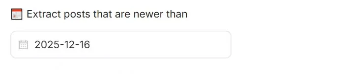 Section titled “7. Date Picker (datepicker)”{ "title": "📅 Extract posts that are newer than", "name": "date", "type": "string", "editor": "datepicker", "format": "DD/MM/YYYY", // Controls the display format shown in the input field (optional) "valueFormat": "DD/MM/YYYY" // Controls the format of the bound value (optional)}
