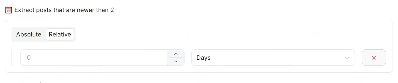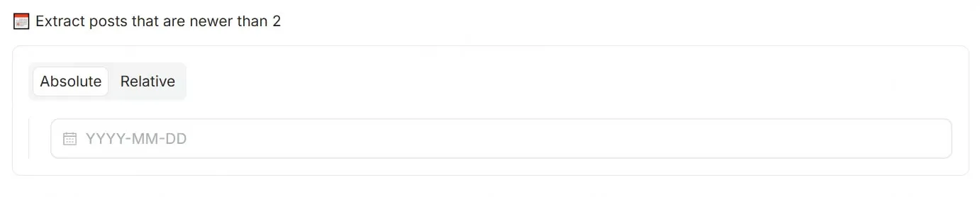 // editor:"datepicker"// dateType: 'absoluteOrRelative'{ "title": "📅 Extract posts that are newer than", "name": "date", "type": "string", "editor": "datepicker", "dateType": "absoluteOrRelative"}