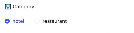 Section titled “5. Radio Group (radio)”{ "title": "🏢 Category", "name": "radio", "type": "integer", "editor": "radioGroup", "options": [ { "label": "hotel", "value": 1 }, { "label": "restaurant", "value": 2 } ], "default": 1}