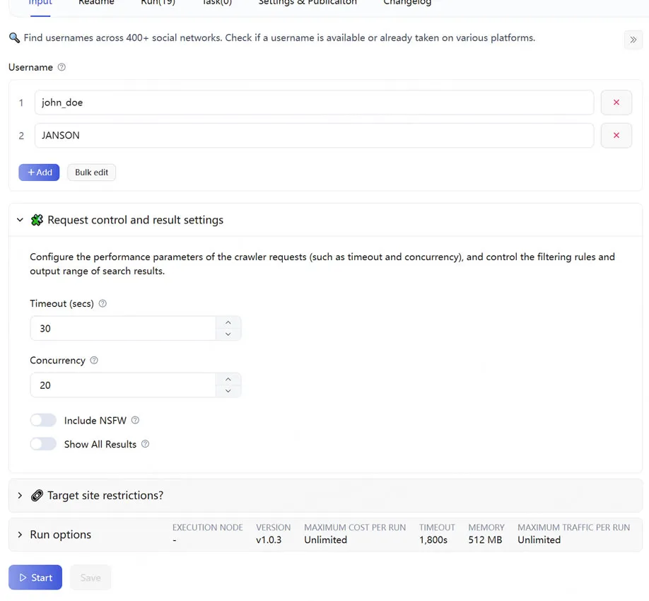 Section titled “Example”{ "description": "🔍 Find usernames across 400+ social networks. Check if a username is available or already taken on various platforms.", "b": "username", "properties": [ { "title": "Username", "name": "username", "type": "array", "editor": "stringList", "description": "Username(s) to search. One per line.", "default": [ { "string": "john_doe" } ], "required": true }, { "title": "Timeout (secs)", "name": "timeout", "type": "integer", "editor": "number", "description": "Request timeout in seconds per site.", "default": 30, "sectionCaption": "🧩 Request control and result settings", "sectionDescription": "Configure the performance parameters of the crawler requests (such as timeout and concurrency), and control the filtering rules and output range of search results." }, { "title": "Concurrency", "name": "maxConcurrency", "type": "integer", "editor": "number", "description": "Maximum concurrent requests.", "default": 20 }, { "title": "Include NSFW", "name": "includeNsfw", "type": "boolean", "editor": "switch", "description": "Include adult content sites in search.", "default": false }, { "title": "Show All Results", "name": "printAll", "type": "boolean", "editor": "switch", "description": "Show all results including not found.", "default": false }, { "title": "Specific Sites", "name": "sites", "type": "array", "editor": "requestList", "description": "Only check these sites (empty = all sites).", "default": [], "sectionCaption": "🔗 Target site restrictions?", "sectionDescription": "Configure the specific list of websites to be checked. If the list is empty, all available sites will be checked by default." } ]}
