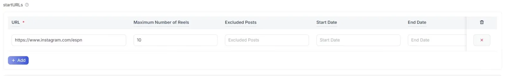 Section titled “10. URL Request Source (requestListSource)”{ "title": "startURLs", "name": "url", "type": "array", "editor": "requestListSource", "default": [ { "url": "https://www.instagram.com/espn", "end_date": "", "start_date": "", "num_of_posts": "10", "posts_to_not_include": "" } ], "param_list": [ { "param": "url", "title": "URL", "editor": "input", "type": "string", "required": true, "description": "This parameter is used to specify the Instagram access URL to be fetched." }, { "param": "num_of_posts", "title": "Maximum Number of Reels", "type": "integer", "editor": "number", "description": "This parameter is used to specify the maximum number of Reels to fetch." }, { "param": "start_date", "title": "Start Date", "type": "string", "editor": "datepicker", "format": "MM-DD-YYYY", "valueFormat": "MM-DD-YYYY", "description": "This parameter is used to specify the start time of the post, format: mm-dd-yyyy, and should be earlier than the \"end_date\"." }, { "param": "end_date", "title": "End Date", "type": "string", "editor": "datepicker", "format": "MM-DD-YYYY", "valueFormat": "MM-DD-YYYY", "description": "This parameter is used to specify the end time of the post, format: mm-dd-yyyy, and should be later than the \"start_date\"." } ], "description": "The URLs of the website to scrape"}
