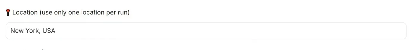 Section titled “1. Single-line Input (input)”{ "title": "📍 Location (use only one location per run)", "name": "location", "type": "string", "editor": "input", "default": "New York, USA"}