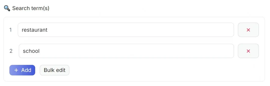 Section titled “11. String List (stringList)”{ "title": "🔍 Search term(s)", "name": "searchTerms", "type": "array", "editor": "stringList", "default": [ { "string": "restaurant" }, { "string": "school" } ]}