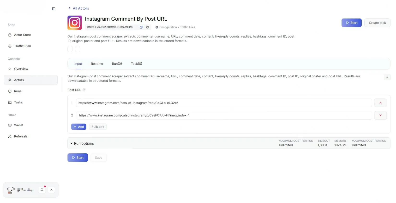 Section titled “Core Example”{ "description": "With our Instagram Reel information Worker tool, after a successful scrape, you can extract the Reel author's username, Reel caption, hashtags used in the post, number of comments on the Reel, Reel publish date, likes count, views count, play count, popular comments, unique post identifier, URL of the Reel's display image or video thumbnail, product type, Reel duration, video URL, post audio link, number of posts on the profile, number of followers on the profile, profile URL, whether the account is a paid partner, and other relevant information. Currently, the tool can scrape via Instagram username, URL, and other methods, and the scrape results can be downloaded in various structured formats.", "b": "startUrl", "properties": [ { "title": "URL", "name": "startUrl", "type": "array", "editor": "requestList", "description": "This parameter is used to specify the Instagram access URL to be fetched.", "default": [ { "url": "https://www.instagram.com/reel/C5Rdyj_q7YN/" }, { "url": "https://www.instagram.com/reel/C85BZjeSHuO" } ], "required": true } ]}Output Example: Input