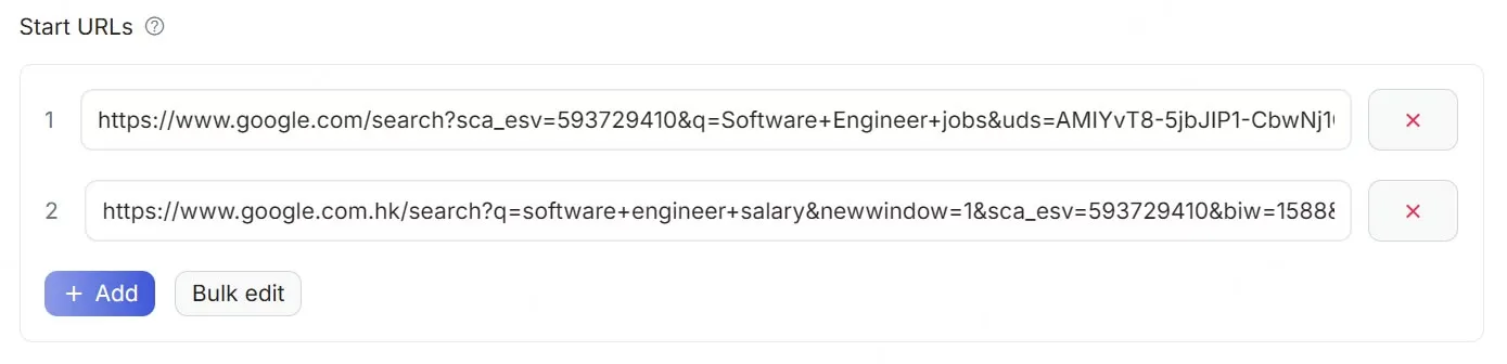 Section titled “9. URL List (requestList)”{ "name": "startURLs", "type": "array", "title": "Start URLs", "editor": "requestList", "default": [ { "url": "https://www.google.com/search?sca_esv=593729410&q=Software+Engineer+jobs&uds=AMIYvT8-5jbJIP1-CbwNj1OVjAm_ezkS5e9c6xL1Cc4ifVo4bFIMuuQemtnb3giV7cKava9luZMDXVTS5p4powtoyb0ACtDGDu9unNkXZkFxC0i7ZSwrZd_aHgim6pFgOWgs0dte0pnb&sa=X&ictx=0&biw=1621&bih=648&dpr=2&ibp=htl;jobs&ved=2ahUKEwjt-4-Y6KyDAxUog4kEHSJ8DjQQudcGKAF6BAgRECo" }, { "url": "https://www.google.com.hk/search?q=software+engineer+salary&newwindow=1&sca_esv=593729410&biw=1588&bih=1273&ei=vEtOadCxI-3AkPIP952z0Qc&oq=Software+Engineer&gs_lp=Egxnd3Mtd2l6LXNlcnAiEVNvZnR3YXJlIEVuZ2luZWVyKgIIAjIKEAAYgAQYQxiKBTIFEAAYgAQyBRAAGIAEMgUQABiABDIFEAAYgAQyBRAAGIAEMgUQABiABDIFEAAYgAQyBRAAGIAEMgUQABiABEj2yQFQ0TFYlbEBcAR4AZABBJgBkwOgAbUXqgEHMi0zLjQuMrgBA8gBAPgBAZgCBqACiAWoAgPCAgoQABiwAxjWBBhHwgIgEAAYgAQYtAIY1AMY5QIY5wYYtwMYigUY6gIYigPYAQGYAwTxBcFiu8bFvIEOiAYBkAYKugYECAEYB5IHCTQuMC4xLjAuMaAHvy6yBwcyLTEuMC4xuAf1BMIHAzItNsgHGIAIAA&sclient=gws-wiz-serp" } ], "required": true, "description": "The URLs of the website to scrape"}