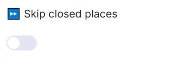 Section titled “8. Toggle Switch (switch)”{ "title": "⏩ Skip closed places", "name": "skipClosed", "type": "boolean", "editor": "checkbox"}