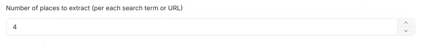 Section titled “3. Number Input (number)”{ "title": "Number of places to extract (per each search term or URL)", "name": "maxPlacesPerSearch", "type": "integer", "editor": "number", "default": 4}