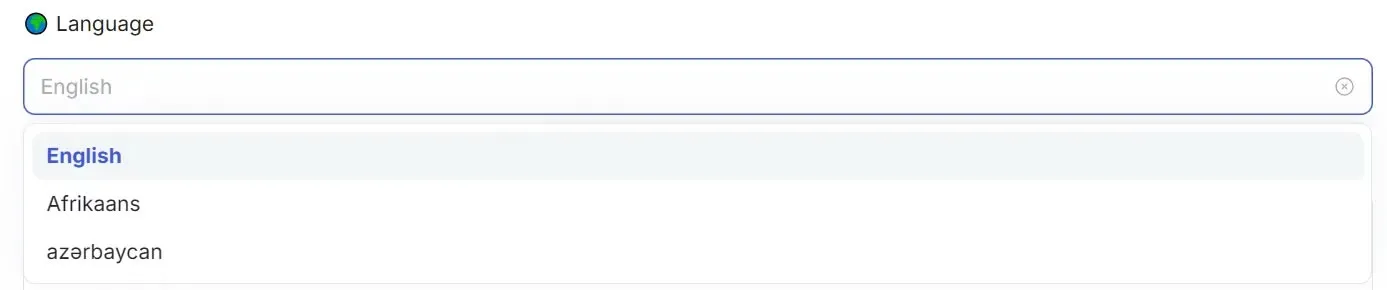 Section titled “4. Dropdown (select)”{ "title": "🌍 Language", "name": "language", "type": "string", "editor": "select", "options": [ { "label": "English", "value": "en" }, { "label": "Afrikaans", "value": "af" }, { "label": "azərbaycan", "value": "az" } ], "default": "en"}